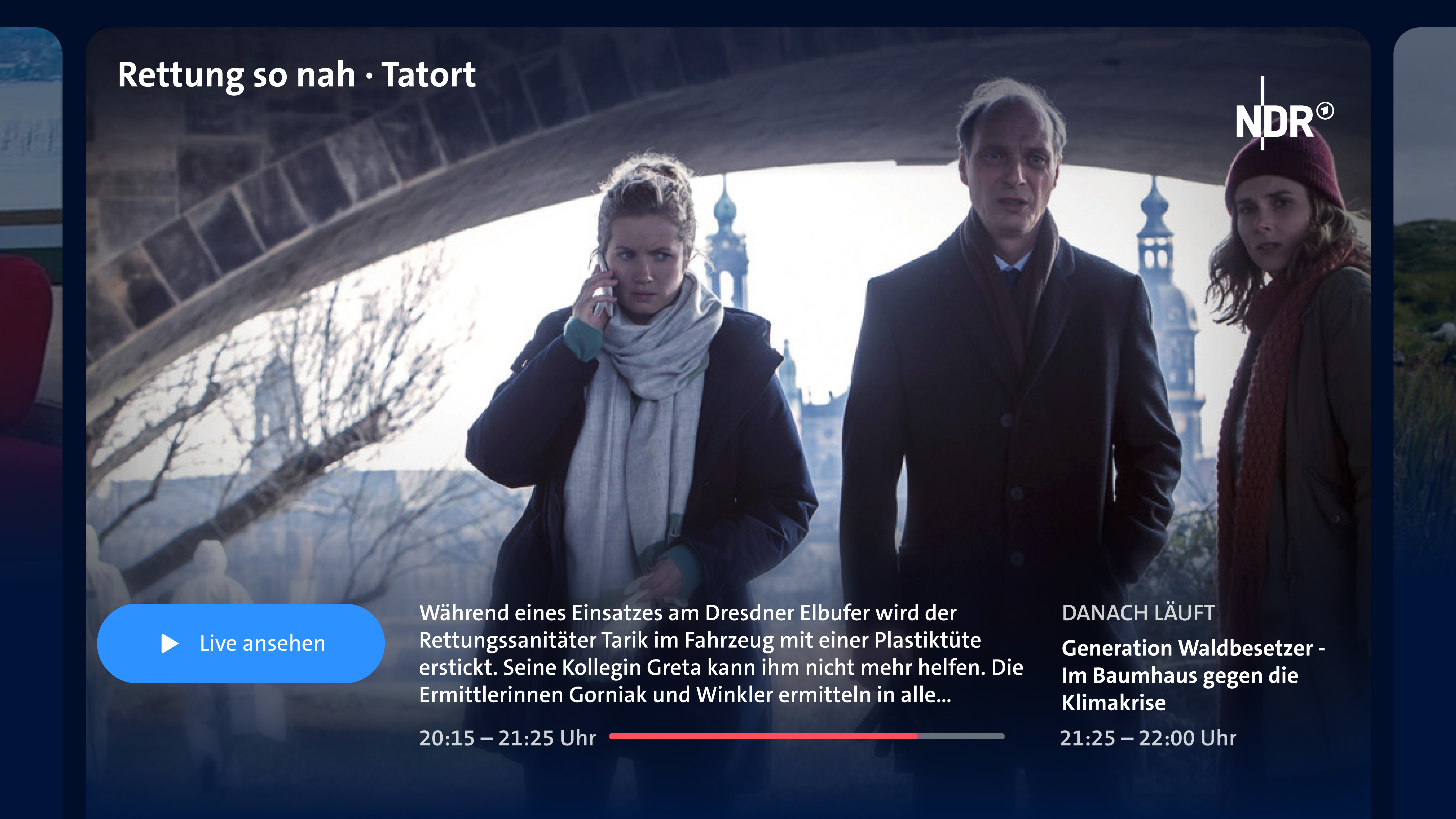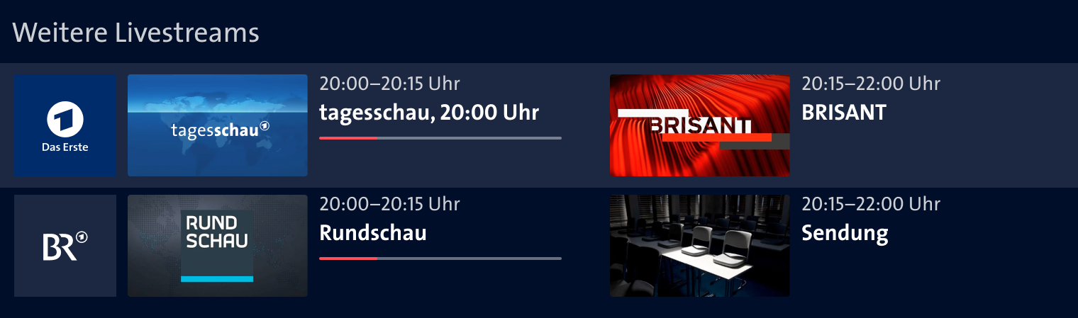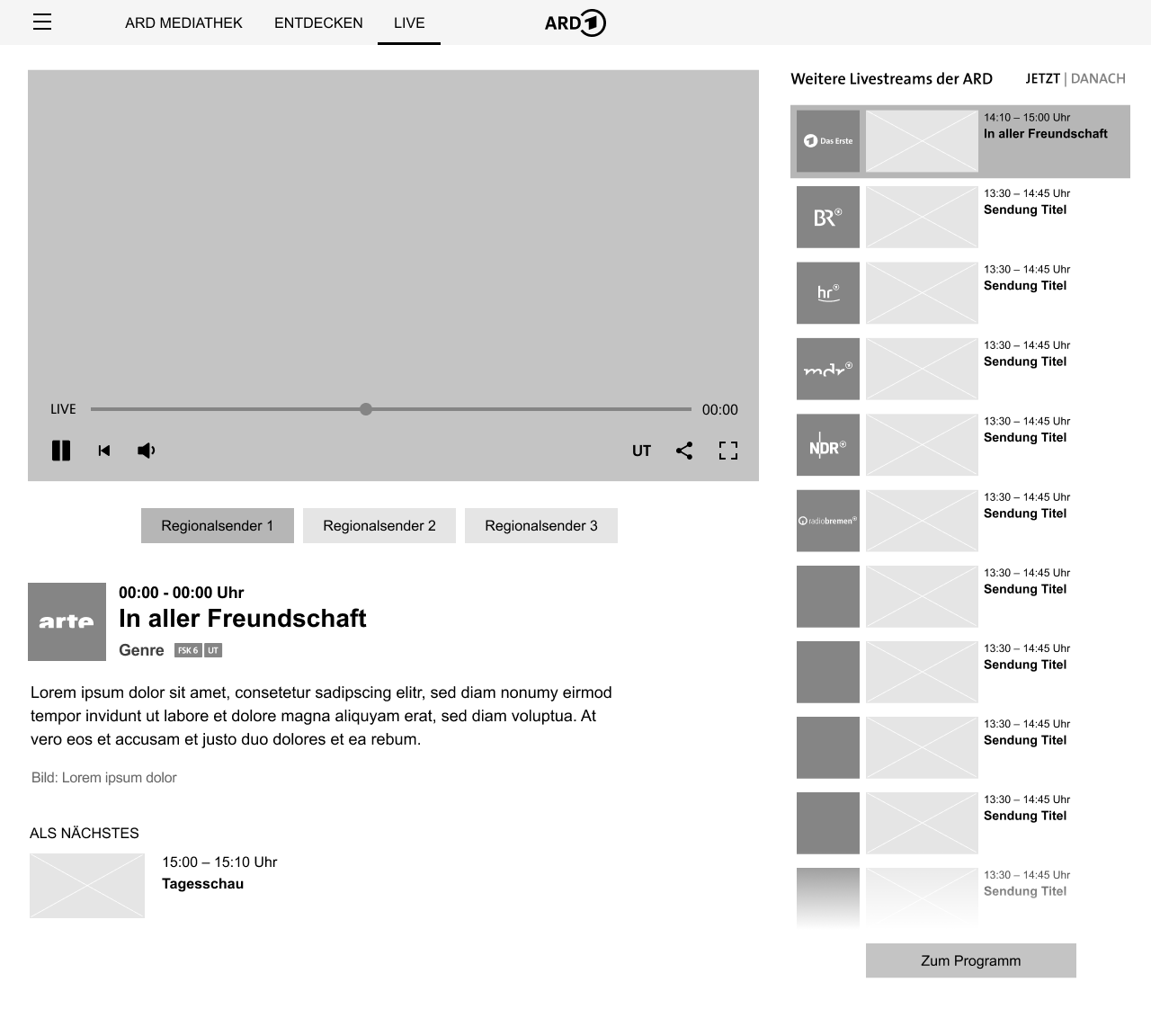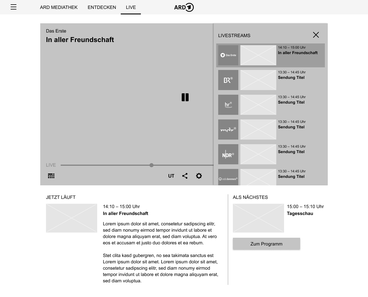 The aim of the project was to redesign the live page for all clients in such a way that more joy of use and a more uniform information hierarchy are achieved. The ARD Mediathek's cross-client design system had to be taken into account and developed further.