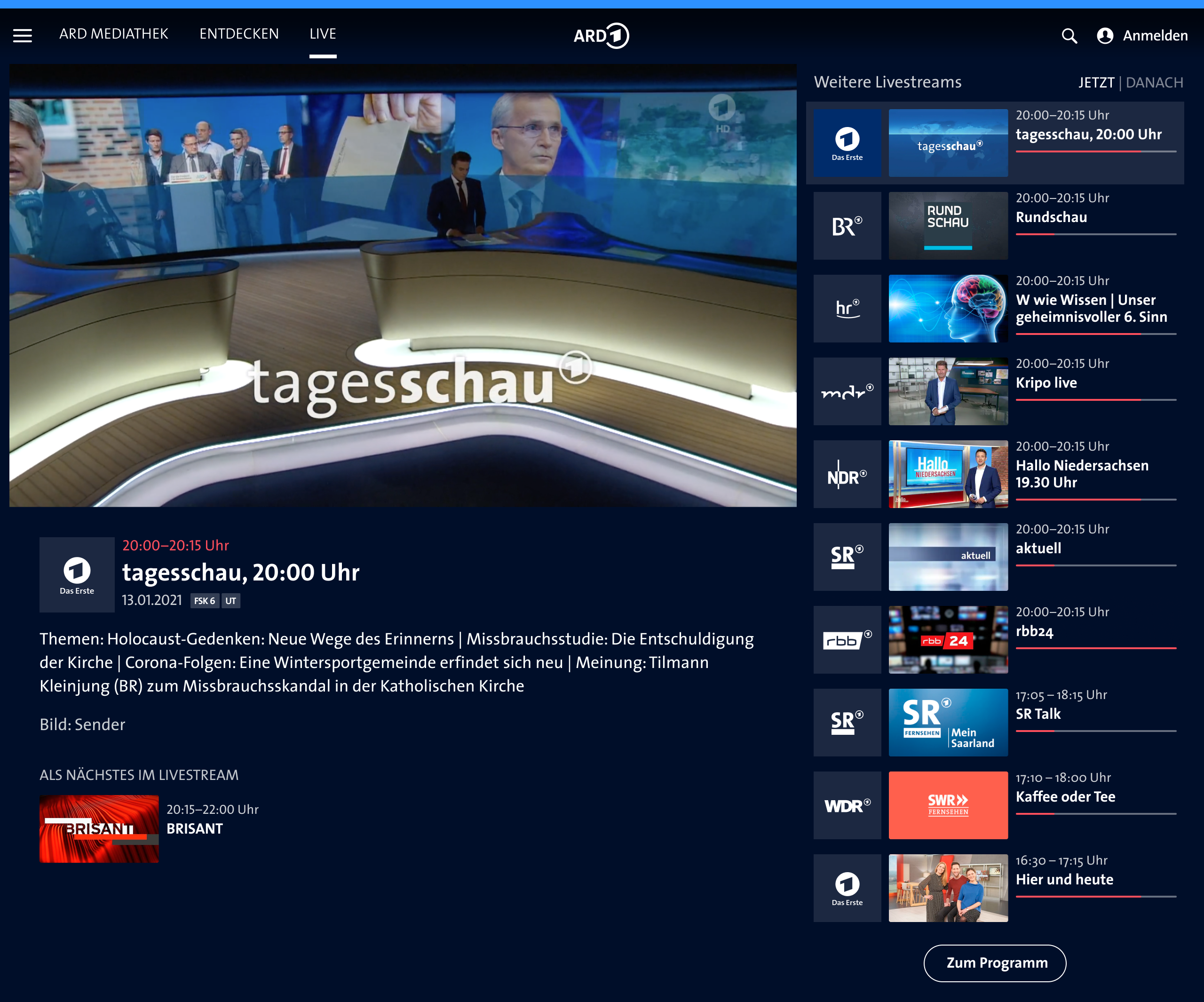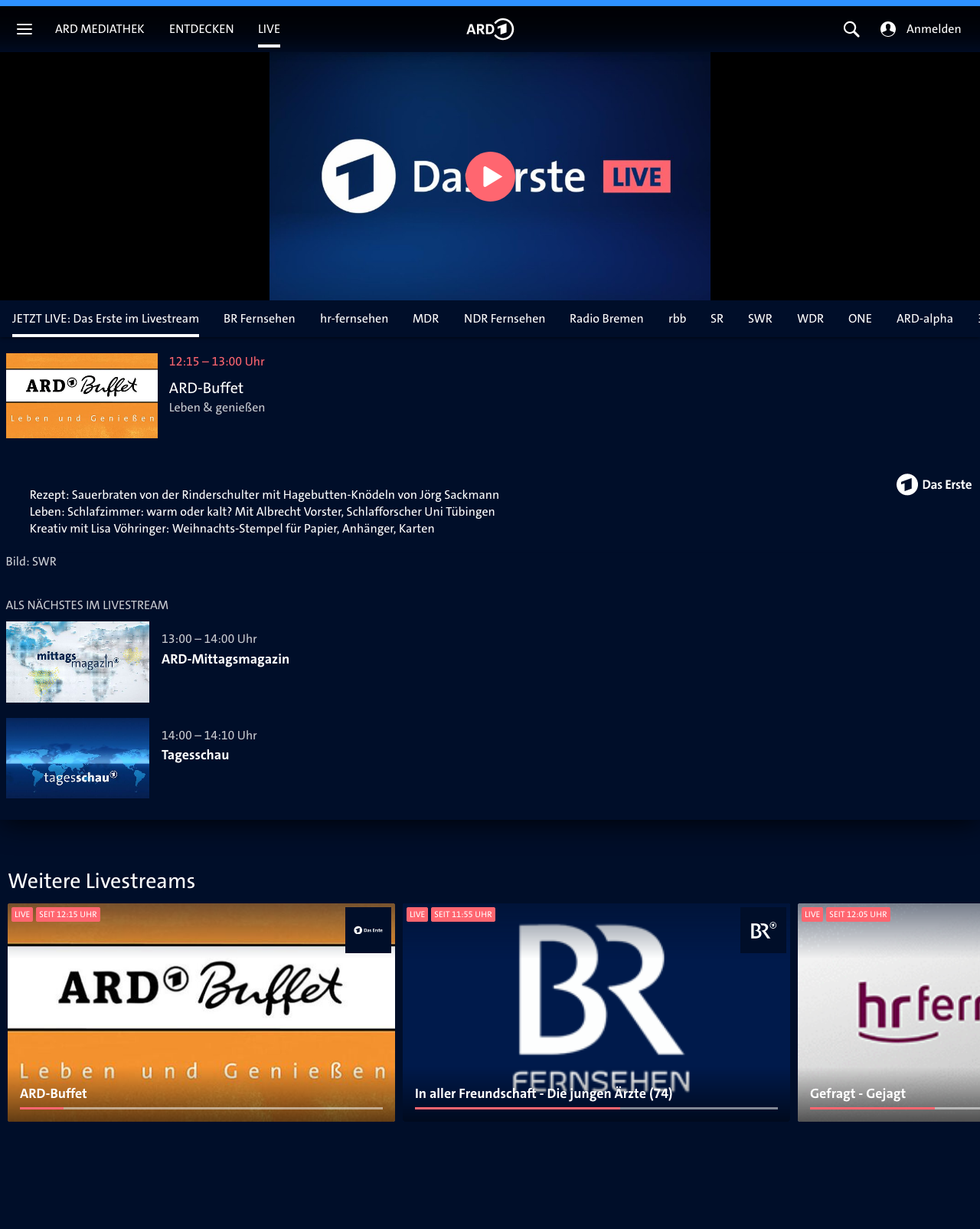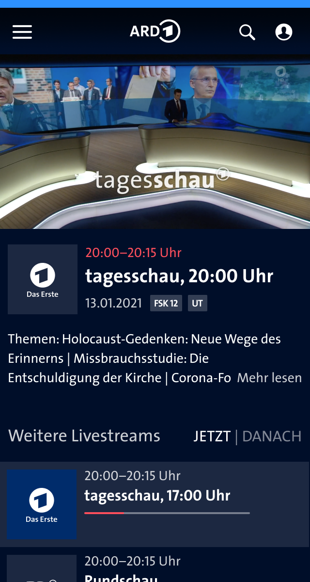 Visitors of ARD Mediathek can watch live broadcasting of almost 20 TV channels as well as smaller, regional live streams of select TV channels.