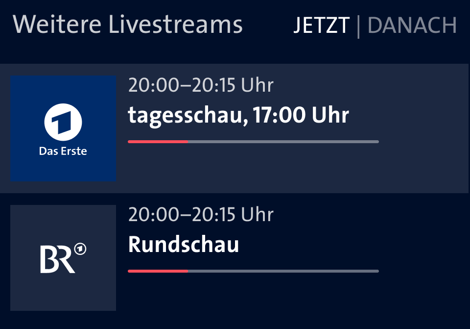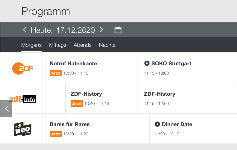 In my evaluation, the program on the ZDF website wasn't working well. Two tab bars one below the other (date, time of day) and directly below them the individual channels very close together presented visual overload.